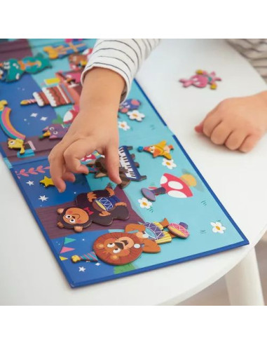Tous les animaux sont présents et une bougie se dresse au milieu de tout le monde, quand la musique commence alors à retentir ! Après tout, de qui fête-t-on l’anniversaire ? Seul votre enfant le décidera. Ce grand décor est pliable et pourra donc facilement être rangé ou glissé dans le sac à dos de votre petit. À chaque instant, il pourra alors s’inventer une multitude de petites histoires tout en stimulant sa motricité fine en manipulant les pièces aimantées. Une fois les éléments en place, il ne reste plus qu’à dresser le décor à la verticale et conter son histoire à son auditoire ! Ce jeu aimanté fait partie de la grande collection des Magnéti'stories, des invitations à la rêverie et l’imagination. Ce jeu magnétique est composé de carton certifié FSC™ ainsi que de matériaux contrôlés.
