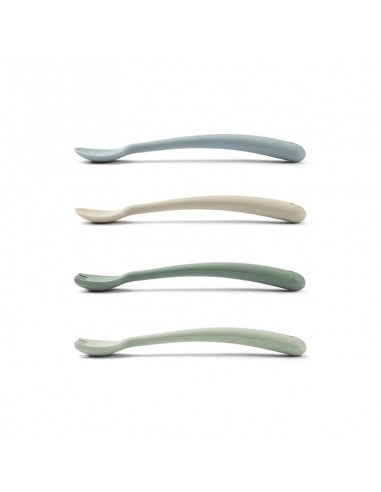 Découvrez le set de 4 couverts Liewood en silicone parfait pour la purée ou les petits légumes de bébé. Les couverts sont fabriqués en 100% silicone ce qui les rend tout doux et agréables à utiliser par les plus petits. Le set est composé de 4 couverts : 2 cuillères et 2 fourchettes, dans de jolies teintes de vert, bleu et sandy.