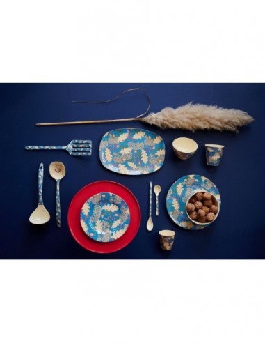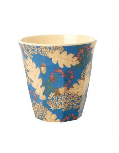 Le fameux gobelet en mélamine RICE, taille médium, imprimé « Autumn and Acorns », avec de magnifiques feuilles de chêne et des baies sur fond bleu, et un intérieur coloris crème.