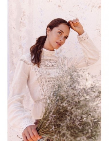 - Blouse bohème vintage en coton pour femme - Jeu de dentelles délicates sur le devant, à l'encolure et aux poignets - Col montant et application de pompons sur le devant- Manches longues et légèrement resserrées aux poignets - Ouverture en goutte d'eau dans le dos refermée par deux boutons